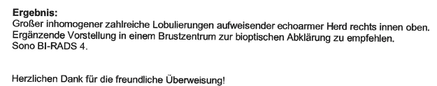 Nach dem mich meine Gynäkologin nach dem Tastbefund direkt in ein Radiologiezentrum zur weiteren Abklärung schickte, wurde ein Ultraschall gemacht und ich bekam eine CD und einen Zettel mit Benutzername und Passwort mit nach Hause – mit der Info, dass ich am nächsten Tag online meinen Befund abrufen könne. Gesagt. Getan. Am nächsten Tag stieg ich in die Online-Plattform ein und lud mir meinen Befund herunter. Da stieß mir gleich das Wort „BIRADS“ ins Auge. So wie viele andere Begriffe, wo ich nur Bahnhof verstand.