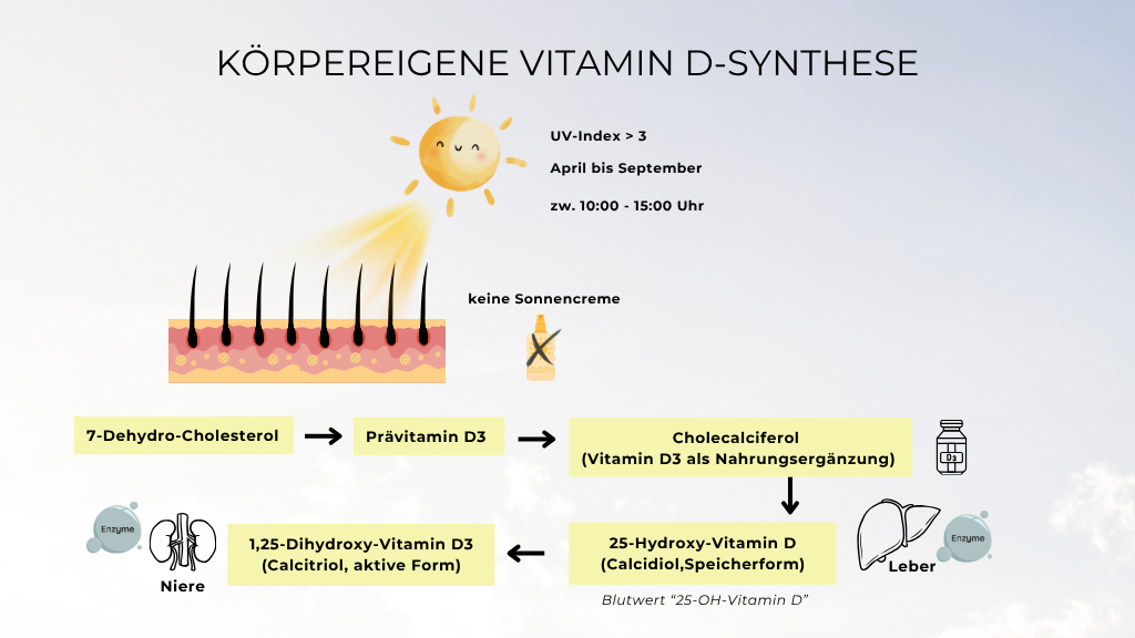 Vitamin D wird durch die Sonneneinstrahlung von der Haut produziert. Dieser Umwandlungsprozess funktioniert folgendermaßen: