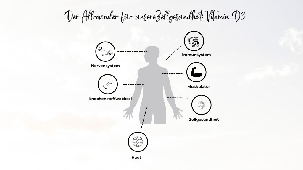 Vitamin D3 ist der Allrounder für unsere Zellgesundheit, weil einfach jedes System besser funktioniert, wenn der Körper ausreichend damit versorgt ist. Hier ein paar Beispiele: